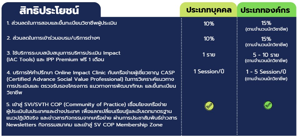 สมาคมผู้ประเมินมูลค่าทางสังคมไทย (Social Value Thailand) มีเป้าประสงค์ในการจัดตั้งขึ้นเพื่อส่งเสริม สนับสนุน เสริมสร้างความรู้ ยกระดับทักษะการประเมิน มูลค่า และผลสัมฤทธิ์ทางสังคม สมาคมฯ เป็นผู้แทนเครือข่ายสมาชิก Social Value International รายเดียวในประเทศไทย โดยมีบทบาทในการเผยแพร่และสร้างความตระหนักและความเข้าใจในหลักการการส่งเสริมคุณค่าสังคม การเข้าถึงองค์ความรู้ กรอบมาตรฐานแนวปฏิบัติ ฐานข้อมูล และกรณีศึกษา (Social Value Principle, Methodology and Framework) พัฒนาเครือข่ายผู้ประเมินตามกรอบมาตรฐานของการประเมิบผลสัมฤทธิ์ทางเศรษฐกิจ สังคม และสิ่งแวดล้อม (Accredited SROI Practitioner Training) ตลอดจนเป็นกลไกส่งเสริมยกระดับวิชาชีพและความน่าเชื่อถือของผู้ประเมินและกระบวนการประเมินตามกรอบมาตรฐานและแนวปฏิบัติสากล (SVI Assurance Standards) และพร้อมส่งเสริมการเรียนรู้ เชื่อมโยง แลกเปลี่ยนความร่วมมือทั้งในและระหว่างประเทศ (Networking & Partnership) เพื่อให้เกิดการส่งเสริมความร่วมมือและขับเคลื่อนการดำเนินงานอย่างมีส่วนร่วมในประเทศไทย สมาคมฯ จึงมุ่งส่งเสริมกลไกการดำเนินงานระหว่างสมาชิกอย่างมีส่วนร่วมเพื่อให้เกิดการเข้าถึงของการดำเนินงานสมาคมฯ ตามวัตถุประสงค์ข้างต้นให้เกิดกระจายอย่างทั่วถึงในประเทศไทย และเกิดการผสานความร่วมมือในระดับสากลสู่การขับเคลื่อนขององค์กร หน่วยงาน และผู้ประเมินในประเทศไทย ผ่านกลไกการดำเนินงานของสมาคมฯ ด้วยการบริหารจัดการโดยคณะกรรมการและที่ปรึกษาสมาคมฯ ผู้กรงคุณวุฒิจากหลากหลายหน่วยงานและสาขาวิชาชีพส่งเสริมกรอบการกำกับดูแลการดำเนินงานอย่างงมีธรรมาภิบาล ที่ดีมีความโปร่งใส ตรวจสอบได้ สิทธิประโยชน์สมาชิก Social Value Thailand เชื่อมโยงเข้าสู่เครือข่ายชุมชน Social Value COP ทั้งในระดับประเทศและระดับสากล ในการพัฒนาขยายผลและต่อยอดความร่วมมือในการขับเคลื่อน ยกระดับการสร้างผลกระทบเศรษฐกิจ สังคม และสิ่งแวดล้อม 1. ประเภทบุคคล เหมาะสำหรับ – ผู้ปฏิบัติงาน ผู้บริหาร นักวิชาชีพในสายงานที่เกี่ยวข้องกับการพัฒนาอย่างยั่งยืน ทั้งในภาครัฐ ภาคเอกชน ภาคสังคม และการศึกษา ตลอดจนสายงานที่มีความเชื่อมโยงกับการออกแบบ วิเคราะห์ พัฒนา และกำกับดูแล ระบบเศรษฐกิจ สังคม และสิ่งแวดล้อม 2. ประเภทองค์กร เหมาะสำหรับ – องค์กรที่มีเป้าหมายในการยกระดับความสามารถในมิติการพัฒนาอย่างยั่งยืน ทั้งในภาครัฐ ภาคเอกชน ภาคสังคม และการศึกษา ตลอดจนมีเป้าหมายที่เป็นรูปธรรม ในการพัฒนาและกำกับดูแลผลกระทบทางเศรษฐกิจ สังคม และสิ่งแวดล้อม ดาวน์โหลด SVTH Membership Program สนใจสมัครสมาชิกได้แล้ววันนี้ !! Post Views: 536