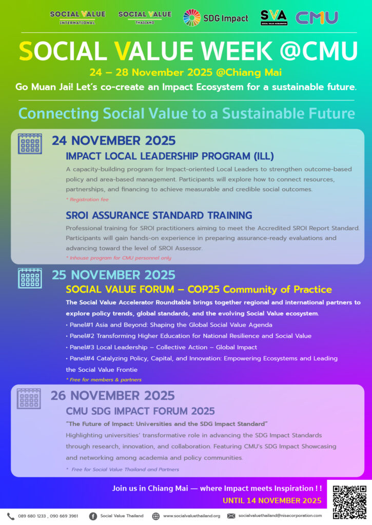 – Professional Development & Global Standards ยกระดับวิชาชีพการประเมินผลลัพธ์เชิงสังคม (SROI / SDG Impact Standard) สู่มาตรฐานระดับสากล